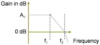 The way to position f2 to obtain the design is shown in Figure 3. At the lowest pole f1, the Bode gain plot breaks slope to fall at 20 dB/decade. The aim is to maintain the 20 dB/decade slope all the way down to zero dB, and taking the ratio of the desired drop in gain (in dB) of 20 log10 Av to the required change in frequency (on a log frequency scale[13]) of ( log10 f2 − log10 f1 ) = log10 ( f2 / f1 ) the slope of the segment between f1 and f2 is: