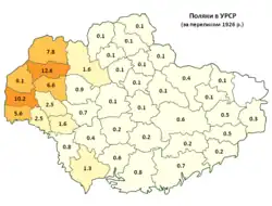 In the 1937-8 Polish Operation of the NKVD, 55,928 people were arrested in the Ukrainian Soviet Socialist Republic, of which 47,327 were shot and 8,601 were sent to gulags.[26] Not all of those arrested were Polish.[27] The Polish population in the Ukrainian SSR fell from 417,613 in 1937 to 357,710 in 1939.[28]