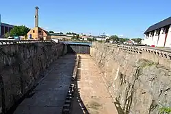 While dry docks in other countries were emptied by the tidal water going out, in this dock water pumps are used, as the Baltic Sea doesn't have any significant tide. The dry dock was built by 600 men and was an international sensation for its advanced design.[3] The drydock has its name from Christopher Polhem, who constructed it. It is described as the Eighth Wonder of the World by the Karlskrona shipyard history association. The water pumps were created by the shipbuilding master Charles Sheldon, they were of a kind already used in Swedish mines.[4] Before converting to steam power in the 19th century around 100 men were required to power the pumps.[2]
