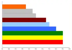 The March 2006 edition of Social Europe: the Journal of the European Left[10] included a chapter called "Women and Social Democratic Politics" by Wendy Stokes. That chapter[11] gave the proportion of female MEPs in each Group in the European Parliament. The results for each Group are given in the adjacent diagram. The horizontal scale denotes gender balance (0% = totally male, 100% = totally female, but no Group has a female majority, so the scale stops at 50%). The results are also given in the table below.