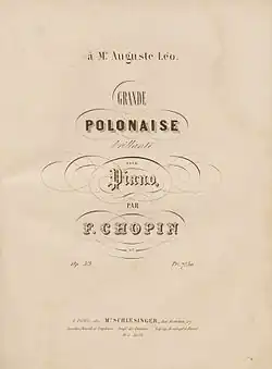 The Polonaise in A♭ major, Op. 53 (French: Polonaise héroïque, Heroic Polonaise; Polish: Heroiczny) is a solo piano piece composed by Frédéric Chopin in 1842[1] The piece was published in 1843,[2] and is one of Chopin's most admired compositions and has long been a favorite of the romantic piano repertoire.[3] Pianist Arthur Rubinstein once called it "the composition which is the closest to my heart."[4] The piece requires exceptional piano skills and great virtuosity to be interpreted at a high degree of proficiency. It is also very physically demanding, and according to his student Adolphe Gutmann, Chopin played it more gently than most performers. The polonaise was dedicated to Auguste Léo, a German banker and friend of Chopin.[2]
