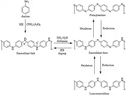 Methods for the polymerization of polyaniline nanofibers seen in literature primarily include [redox|chemical oxidative] polymerization, interfacial synthesis, and "rapid mixing" methods.[3][4][5][6] Other less common methods include nanofiber seeding, electrosynthesis, electrospinning, and preforming polymerization in dilute aniline solutions.[7]