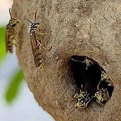 - ^ a b c d e f g O'Donnell, Sean; Jeanne, Robert L. (2002). "The nest as fortress: defensive behavior of Polybia emaciata, a mud-nesting eusocial wasp". Journal of Insect Science. 2 (1): 3. doi:10.1093/jis/2.1.3. PMC 355903. PMID 15455037.