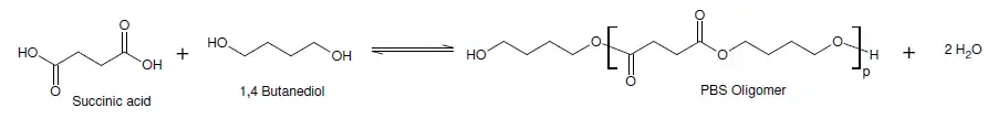 Like other polyesters such as polyethylene terephthalate, two main routes exist for the synthesis of PBS: the trans-esterification process (from succinate diesters) and the direct esterification process starting from the diacid. The direct esterification of succinic acid with 1,4-butanediol is the most common way to produce PBS. It consists of a two step process. First, an excess of the diol is esterified with the diacid to form PBS oligomers with elimination of water.