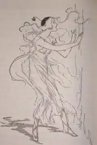 When Dorothy Gale, her pet dog Toto, the Shaggy Man, and Button-Bright first encounter Polychrome in the fifth chapter of The Road to Oz, she is seen dancing to keep herself warm, after accidentally sliding off her father's rainbow and landing on the surface of the Earth. (Her father withdrew his bow without realizing she had been left behind.) Polychrome is described as: