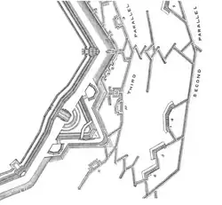 Other European engineers quickly adopted the three-parallel Vauban system, which became the standard method and would prove to be almost infallible.[2] Vauban designed three systems of fortification, each having a more elaborate system of outworks, which were intended to prevent the besiegers from enfilading the bastions. During the next century, other engineers tried and failed to perfect the bastion system to nullify the Vauban type of attack.[3] During the 18th century, it was found that the continuous enceinte, or main defensive enclosure of a bastion fortress, could not be made large enough to accommodate the enormous field armies which were increasingly being employed in Europe; neither could the defences be constructed far enough away from the fortress town to protect the inhabitants from bombardment by the besiegers, the range of whose guns was steadily increasing as better manufactured weapons were introduced.[4][5]