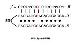 PPRHs can be designed for virtually any gene in the genome by searching for polypirimidine stretches in the sequence of the desired gene. Optimal lengths for each domain of the PPRHs are within 20–30 nucleotides. The total length of a typical PPRH is 55 nucleotides considering two domains of 25 bases plus 5T for the linking loop. If purine interruptions are encountered (up to three) within the polypirimidine target, the highest affinity of PPRH binding is achieved by placing in the hairpin the complementary base (a pyrimidine) in front of the purines[17] (Wild type-PPRH).