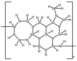 In polysilazanes, each silicon atom is bound to two nitrogen atoms and each nitrogen atom to at least two silicon atoms (three bonds to silicon atoms are also possible). If all remaining bonds are with hydrogen atoms, perhydropolysilazane [H2Si−NH]n results (proposed structure is shown to the right). In organopolysilazanes, at least one organic substituent is bound to the silicon atom. The amount and type of organic substituents have a predominant influence on the macro-molecular structure of polysilazanes.[3] Silazane copolymers are normally produced from ammonolyses of chlorosilane mixtures. In this chemical reaction, different chlorosilanes react at similar rates so that the monomers are statistically distributed in the copolymer.