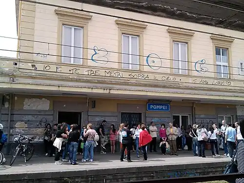 Originally, the station was simply named Pompei. Later, to avoid confusion with the Pompei Scavi-Villa dei Misteri station on the Torre Annunziata–Sorrento line, the name Santuario (meaning Shrine) was added, reflecting the station's proximity to the Shrine of the Virgin of the Rosary of Pompei.[1]
