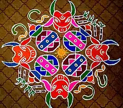 The festival is marked with colorful kolam artwork. Kolam is a form of traditional decorative art that is drawn by using rice flour often along with natural or synthetic color powders.[31] It includes geometrical line drawings composed of straight lines, curves and loops, drawn around a grid pattern of dots.[32]