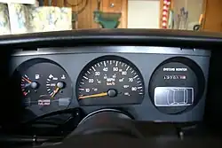 The Grand Am included Strato bucket seats upholstered in Naugahyde vinyl or corduroy cloth featuring manual recliners and adjustable lumbar supports - both features common on European-style sports/luxury sedans, but unusual for American cars of that time. Also included were an instrument panel from the Pontiac Grand Prix featuring a Rally gauge cluster with fuel, oil, water and volt gauges (a tachometer or fuel economy gauge was optional, and on cars so equipped, the clock was moved to a space on the lower instrument panel under the radio), three-spoke padded steering wheel with brushed-stainless spokes, and Genuine Crossfire African Mahogany trim on the dash facing, radio and clock surrounds, as well as the center console between the front seats.[11][12] Grand Ams also were among the first U.S.-built cars with a turn-signal mounted headlight dimmer switch that had been common on imported cars for decades.[13] Other standard equipment included concealed windshield wipers, a 1.12 in (28 mm) front stabilizer bar, and an in-the-windshield radio antenna.[3] Upscale options included air conditioning, tinted glass, power windows-locks-seat, rear defogger, various sound systems, and tilt-steering-wheel. AM/FM stereo with a tape player was optional.[3] The listed retail price for the 2-door coupe was US$4,264 ($30,203 in 2024 dollars [14]), listing it above the Firebird Trans Am.[3]