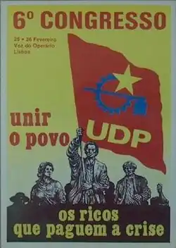 The Popular Democratic Union (Portuguese: União Democrática Popular, pronounced [uniˈɐ̃w dɨmuˈkɾatikɐ pupuˈlaɾ], or UDP) is a Marxist political movement in Portugal. The UDP transformed itself into a political association at its 15th congress due to its merger with other left-wing parties in the Left Bloc.