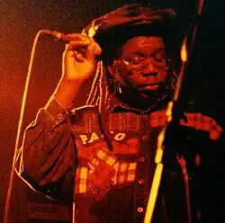 Publicity for blues parties was largely through word of mouth or over pirate radio stations and generally did not include precise details of addresses or locations, so sound systems attracted loyal but highly localised followings.[127] Sounds would also often "play out" in neighbouring areas or challenge other sound systems in a competitive sound clash, allowing the more prominent outfits to attract wider attention – during the 1970s and 1980s the better-known Handsworth sounds would attract visitors from as far afield as London, Manchester and Bristol.[128] Notable Birmingham sound systems whose reputations extended beyond the city included Quaker City, which was founded in 1965;[129] Duke Alloy, which was founded in 1966 and featured the toaster Astro who later became part of UB40;[130] and Wassifa, which featured Macka B, the most influential British toaster of the 1980s.[131] The founders of the reggae band Eclipse, who met at a blues party, later recalled "Blues would took place everywhere. You only had to go out in Lozells or down the Soho Rd, there was loads going on, you could stand and listen to the music coming out of the houses, pubs and clubs."[123]