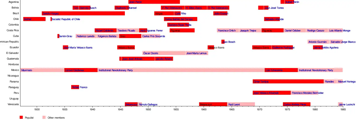 Populism has been an important force in Latin American political history, where many charismatic leaders have emerged since the beginning of the 20th century, as the paramountcy of agrarian oligarchies had been dislocated by the onset of industrial capitalism, allowing for the emergence of an industrial bourgeoisie and the activation of an urban working class,[7] causing the emergence of reformist and multi-class nationalist politics, centered on a charismatic leadership,[8] such as Aprismo founded by Víctor Raúl Haya de la Torre,[9] and Juan Velasco Alvarado (1968–1975) in Peru,[10] Germán Busch (1936–1939),[11] Gualberto Villarroel (1943–1946)[12] and the MNR[13] and later Juan José Torres (1970–1971)[14] in Bolivia, the Socialist Party of Chile[15] (before adopting a more Marxist line and distancing from APRA)[16] and the political movements gravitating around Perón (1946–1955, 1973–1974) concentrated in the Justicialist Party in Argentina,[17] Carlos Ibáñez del Campo's movement in Chile (1927–1931, 1952–1958),[18] Getúlio Vargas' Brazilian Labour Party (1930–1945, 1951–1954)[19] and Adhemar de Barros's Social Progressive Party in Brazil,[20] Jorge Eliécer Gaitán's National Leftist Revolutionary Union[21] and Gustavo Rojas Pinilla's National Popular Alliance (1953–1957) in Colombia,[22] Rafael Ángel Calderón Guardia's movement (1940–1944)[23] and José Figueres Ferrer's National Liberation Party (throughout the 1940s and 1970s) in Costa Rica,[24] Ramón Grau's Partido Auténtico in Cuba (1933–1934, 1944–1948),[25] Juan Bosch's Dominican Revolutionary Party (1963),[26] Assad Bucaram's Concentration of People's Forces,[27] and Velasco Ibarra's National Velascist Federation (throughout the 1930s to 1960s)[28] Revolutionary Action Party in Guatemala (1944–1954),[29] and Guillermo Rodríguez (1972–1976) in Ecuador,[30] the Institutional Revolutionary Party under Lázaro Cárdenas (1934–1940)[31] and under Luis Echeverría (1970–1976) in Mexico,[14] Omar Torrijos's Democratic Revolutionary Party (1968–1981) in Panama,[32] Rafael Franco (1936–1937) and his Febreristas in Paraguay[33] and Democratic Action under Rómulo Betancourt (1945–1948, 1959–1964)[34] and Carlos Andrés Pérez (1974–1979) in Venezuela.[4] Which parties and movements are "national-populist" remains disputed.[35] Óscar Osorio (1948–1956)[12] created the Revolutionary Party of Democratic Unification in El Salvador modeled after the Mexican PRI but his regime reversed many reforms in face of a "communist threat"[36] and Fulgencio Batista started of populist.[37] Ideologically, Latin American populism, with its emphasis on nation-building under an authoritarian leadership as a prerequisite for technological modernization, betrayed the earlier influence of Comtean positivism. Socially, for many authors—such as Brazil's Octavio Ianni—populism should be understood as the political alliance between an emerging industrial bourgeoisie and a newly organizing urban working class, in which the former accepts social reforming for the latter's sake as long as the working class remains politically subordinated to both a more or less authoritarian State and private enterprise,[38] in a process of controlled inclusion of the "masses" into the political system,[39] a co-opting process some Marxist authors like Brazil's Francisco Weffort ascertain was accepted by the newly urbanized working class given their lack of a previously developed class consciousness.[40] Even though many of these national-populist parties or their successors like Bolivian Revolutionary Left Movement or Brazilian Democratic Labour Party joined the Socialist International they did not define themselves as socialist or social democratic but they were social-reform-oriented.[41] They came to power through coup d'états presented as revolutions like the Mexican Revolution (1911–1920), Brazilian Revolution of 1930, Cuban Revolution of 1933, Paraguayan February Revolution of 1936, Bolivian Socialist Revolution of 1936, 1943 Argentine Revolution, Guatemalan Revolution (1944), Venezuelan October Revolution of 1945, Costa Rican Revolution of 1948, Salvadoran Revolution of 1948, Bolivian National Revolution of 1952, Dominican April Revolution of 1965 (failed), Peruvian Revolution of 1968 and the Panamanian Revolution of 1968.