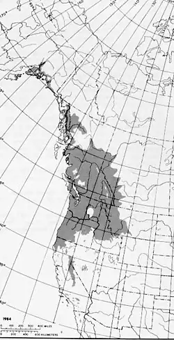 The native range of P. trichocarpa covers large sections of western North America. It extends from Southeast Alaska's Kodiak Island and Cook Inlet to latitude 62° 30° N., through British Columbia and the forested areas of Washington and Oregon, to the mountains in southern California and northern Baja California (31°N). It is also found inland, generally on the west side of the Rocky Mountains, in British Columbia, southwestern Alberta, western Montana, and north-to-central Idaho.[14] Scattered small populations have been noted in southeastern Alberta, eastern Montana, western North Dakota, western Wyoming, Utah, and Nevada.