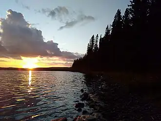 Woody River Recreation Site (52°28′45″N 101°42′03″W / 52.4791°N 101.7009°W)[18] consists of separate parcels of land plus additional Crown land centred around several lakes, Woody River, and Midnight Creek in the Porcupine Hills. Access is from Highway 980, which connects all of the lakes and amenities in the park, and by snowmobile. When travelling by snowmobile from the town of Hudson Bay, there are two warm-up shelters along the way.[19] Accessible lakes within the East Block include Isbister, Spirit, Smallfish, Woody, Elbow, and Townsend. All six lakes have boat access and fish commonly found in the lakes include walleye, perch, and northern pike. Campsites and picnic areas exist at Spirit, Isbister, Smallfish, and Townsend Lakes.[20] A rough ATV trail begins at the Spirit Lake Campground and heads north-east past Spirit Mountain and goes to Armit Lake, which is the largest lake in the Porcupine Hills.