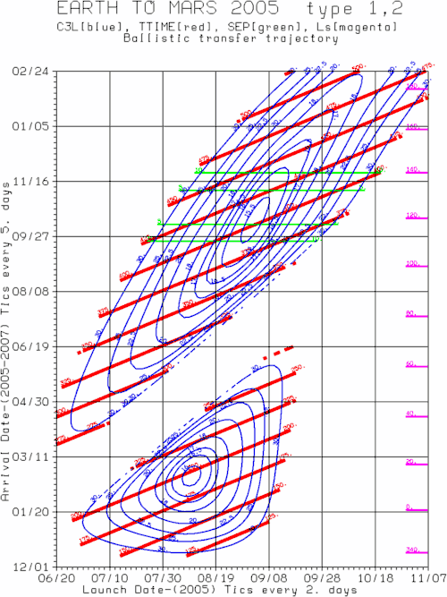 - ^ a b Goldman, Elliot. "Launch Window Optimization: The 2005 Mars Reconnaissance Orbiter (MRO) Mission". Colorado Center for Astrodynamics Research. Archived from the original on 2017-04-13. Retrieved 2007-12-30.