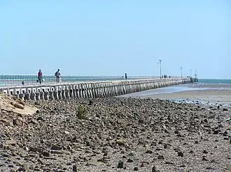 The Port Germein jetty opened in 1881, and in 1883 it was extended to a length of 1680 metres.[12] This length, which was necessary because of the town's extremely shallow beach, briefly made it the longest wooden jetty in the southern hemisphere.[13] Currently, following storm damage and subsequent repairs, the jetty is 1532 metres long, still the longest jetty in South Australia. Previously it had a narrow-gauge railway line extending into the township.[14]