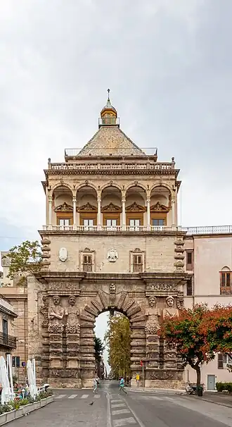 After Charles V's conquest of Tunis, the Emperor came to Sicily. He entered in Palermo through this gate on 13 September 1535.[2] In order to commemorate this event, the Senate of Palermo decreed to rebuild the gate in a more sumptuous style.[2] The Viceroy of Sicily Marcantonio Colonna set off the construction in 1583.[2] The gate was completed in 1584.[2] The Viceroy renamed it "Porta Austriaca" (Austrian Gate).[2] For this reason the building was also called "Porta Imperiale" (Imperial Gate).[2] But nevertheless, the name "Porta Nuova" continues to be used.