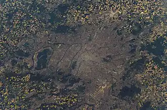 ![]() The city of Paris, photographed from Earth orbit by astronauts aboard the International Space Station. The River Seine winds its way through the center of the image. The gray and purple pixels are the urban areas, and the patchwork of green, brown, tan and yellow surrounding the city is farmland |