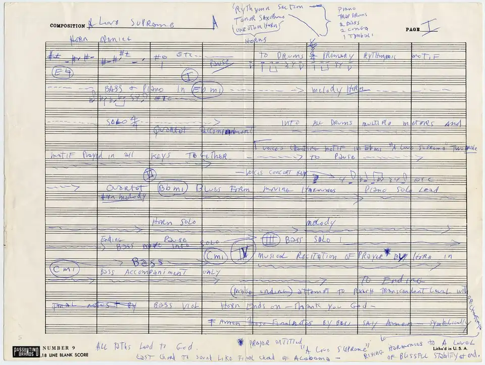 Handwritten sheet music for John Coltrane's religious suite A Love Supreme