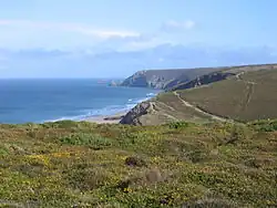 Porthtowan lies along the 627-hectare (1,550-acre) Godrevy Head to St Agnes heritage coast,[2] which is located on the north Cornwall coast of the Celtic Sea in the Atlantic Ocean. It lies between Godrevy Head (with the Godrevy Towans) and St Agnes Head, north of the village of St Agnes.[3][4][5] The Godrevy to St Agnes Heritage Coast has been a nationally designated protected area since 1986. The marine site protects 40 species of mammals and amphibians.[6][7]