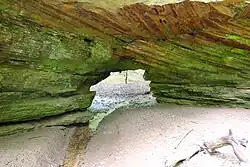 Portland Arch is one of only a few natural arches in Indiana. The arch was created through the Mansfield Sandstone by Bear Creek, undercutting the bluff on both sides. The sandstone was strong enough that it did not collapse. The Mansfield Sandstone is from the Pennsylvanian Period, some 230 million years ago. The cross stratification of the layers were formed in s shallow bottomed lake where it drops into deeper water. The slope reflects the change from the shallows into deeper water. Are like this were used as rock shelters by Native Americans and early pioneers. Along the valley escarpment, talus rocks have fallen into the valley.[1]