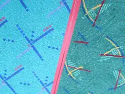 To reduce the amount of noise created by people walking across hard terminal floors, the Port of Portland contracted SRG Partnership to design new carpeting for Portland International Airport (PDX) in 1987. The SRG principal and co-designer of the carpet, Jon Schleuning, visited several airports before deciding what to create for the carpet at PDX. SRG steered away from the earth tones traditionally used by airports in the 1980s, incorporating blue and green into their design early on and hoping to evoke "northwest to the core".[7] Its pattern featured geometric shapes on a teal background,[8] an abstract depiction of the intersecting north and south runways seen by air traffic controllers from the airport's tower at night.[7][9][10] Several acres of the carpet were installed by the early 1990s.[7]