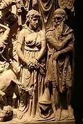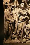 The cover of the sarcophagus has two large acroterions depicting gargoyles and is decorated with a low-relief frieze that depicts a life story (the presentation of a baby to its mother, his education, marriage, and a dedication to Clementia). The face, as on the main sarcophagus, is not depicted.[5] The sarcophagus inscription suggests that it houses a general named Aulo Giulio Pompilio Tito Vivio Levillo Pisone Bereniciano.