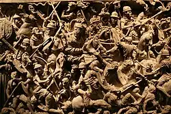 From the Flavian era to the Antonine dynasty, one of the primary themes of Roman art was its military victories over other peoples outside its borders. Roman artists created these celebratory representations both in public space with triumphal arches, columns, and templates and private space (as in funerary reliefs and sarcophagi).[3] In the 3rd century, the Roman senatorial class lost all its military power, so battle scenes were no longer used for their sarcophagi—they were often carved with representations of philosophers or muses instead.
