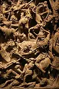 The Portonaccio sarcophagus, compared to earlier works like the Sarcofago Amendola, avoids a Hellenistic manner. The sarcophagus exhibits a composition that is more frenetic and articulated, particularly when compared to sculptures of monomachy. The sculpture's sense of movement is accentuated by its high relief.[5] Figures emerge in the round, while the background is frenzied, never neutral. The faces are expressive, the bodies of the victors dramatically tangled, their lances and symbols realistically cross the space, never appearing on only one plane. The sarcophagus cover is similar to the side reliefs, although it includes elements of Roman Arte plebea and Arte provinciale romana such as the uninterrupted narrative and the unnatural drapery.