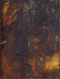 The reverse of Albrecht's panel contains a rendition of the allied Dürer and Holper families' coats of arms,[37] which are shown beneath a winged Moor wearing a red dress.[38] The Dürer family are represented by a crest showing an open door, a pun on the word Dürer (Thürer meaning 'doormaker'). Albrecht the Elder was born in the Hungarian village of Ajtó. Ajtos is Hungarian for "door"—when his parents moved to Germany their name changed from Tür to Düre.[39][E][20] The Holper crest features a stag, but its significance is lost.[41] The back of Barbara's panel contains imagery of a dragon in a lightning storm set against a rocky landscape or cliff.[7]