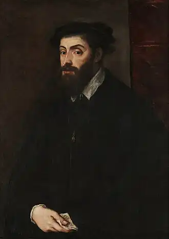 The earliest definitive sources on the work date to the mid 17th century when - now moved from Rome to Parma - the work's subject was lost and it was retitled Portrait of a Philosopher, Portrait of a Man in Black or Portrait of Ferdinand I (Charles's younger brother).[1] In Parma it was also misattributed to Girolamo Mazzola.[1] It moved to Naples in 1734 with the rest of the Farnese Collection when it was inherited by Charles III of Spain after the death of the last Farnese Elisabetta, upon which the original attribution was restored. A long restoration in the 20th century re-identified Charles as the work's subject.[1]
