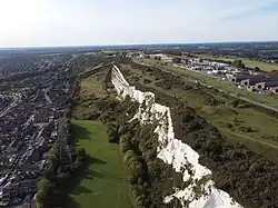 Portsdown Hill is a long chalk ridge in Hampshire, England. The highest point of the hill lies within Fort Southwick at 131 m above sea level. The ridge offers good views to the south over Portsmouth, the Solent, Hayling Island and Gosport, with the Isle of Wight beyond. The hill is on the mainland, just to the north of Portsea Creek, which separates the mainland from Portsea Island, on which lies the main part of the city of Portsmouth, one of the United Kingdom's main naval bases. To the north lies the Forest of Bere, with the South Downs visible in the distance. Butser Hill can be seen on a clear day. The hill is formed from an inlier of chalk which has been brought to the surface by an east–west upfold of the local strata known as the Portsdown Anticline.[1]