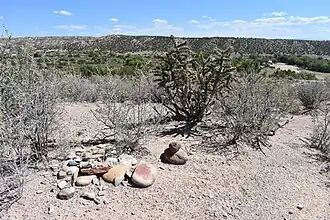 Posi-Ouinge, the 'Greenness Pueblo,' is a large prehistoric village dated to the 13th through the 16th centuries AD. The pueblo may have had well over 2,000 rooms, making it one of the largest in the southwest. The village was inhabited by Tewa Indians whose descendants now live near the Rio Grande in the Espanola area. The word 'Tewa' refers to a group of Puebloan inhabitants living along the northern Rio Grande and speaking a similar language. Today, the pueblo lies above the hot springs resort at Ojo Caliente. A short, self-guided hike beginning just west of the Mineral Spring Hotel takes you up onto the river terrace above and then around the site through room blocks and to vistas with beautiful views of the Ojo Caliente valley.[2]