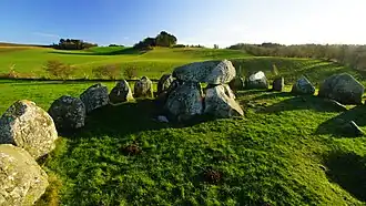 Poskær Stenhus is the largest round barrow in Denmark, dating back to 3.300 B.C. It is located by the village Knebel on the hilly southern part of the peninsula Djursland, at the entrance to the Baltic Sea between Denmark and Sweden in northern Europe.[1] The central burial chamber is equipped with a capstone weighing 11 tonnes (12 tons), surrounded by 23 slabs taller than a man, forming a circle.[1]