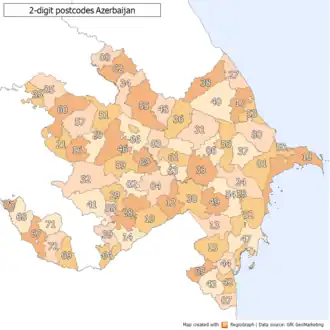 The four-digit postcode indicates the nationwide format AZ NNNN. The first two digits indicate the regions of Azerbaijan in accordance with the modern administrative divisions, including the Nakhchivan Autonomous Republic the postal codes are technically out of use and there is no the delivery of mail conducted between Nagorno-Karabakh and the rest of Azerbaijan.