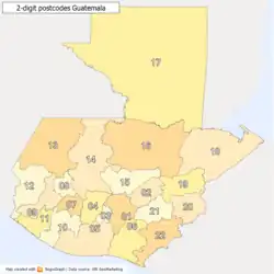 Postal codes in Guatemala are 5 digit numeric. The first two numbers identify the department, the third number the route/municipality and the last two the office.