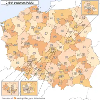 In Poland, postal codes are used for assigning post to addresses.[1] They were introduced in 1973. They are five-digit codes of two-then-three digits, with a hyphen between them. The first digit indicates one of the 10 large postal regions the country is divided into. These areas do not follow the administrative divisions. The second and third digits specify a particular smaller region (originally the number of a regional sorting office, there was one in every county), and the last two are the number of a postal delivery branch.
