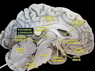 ![]() Sagittal cross-section of the human brain. The posterior commissure is labelled at center top. | |