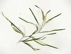 Potamogeton compressus produces a strongly flattened, robust, branching stem up to 90 cm in maximum length.[4] It grows annually from turions and seed, producing bushy plants branching near the surface with long, rather grass-like leaves that are 85–240 mm long and 3–6 mm wide and olive-green or dark green, sometimes with a reddish tinge near the surface.[4] Each leaf has two veins either side of the midrib and is bluntly pointed. The leaves have a rather opaque appearance compared to the transparent leaves of most pondweeds due to the presence of fibres called sclerenchymatous strands. There are no rhizomes or floating leaves.