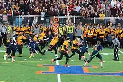 It is not clear when the first powderpuff football game was played. There is photographic evidence of it being played as early as 1931 at Western State College of Colorado (now Western State Colorado University) in Gunnison, Colorado.[1] One of the first well-documented powderpuff football games was played on October 20, 1945, at Eastern State Teachers College, in Madison, South Dakota.[2] Eastern State Teachers College had previously cancelled many campus activities for the duration of World War II. Among these events were the annual homecoming celebration and intercollegiate sports, including football.[3]