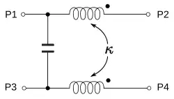 The symbols most often used for directional couplers are shown in figure 1. The symbol may have the coupling factor in dB marked on it. Directional couplers have four ports. Port 1 is the input port where power is applied. Port 3 is the coupled port where a portion of the power applied to port 1 appears. Port 2 is the transmitted port where the power from port 1 is outputted, less the portion that went to port 3. Directional couplers are frequently symmetrical so there also exists port 4, the isolated port. A portion of the power applied to port 2 will be coupled to port 4. However, the device is not normally used in this mode and port 4 is usually terminated with a matched load (typically 50 ohms). This termination can be internal to the device and port 4 is not accessible to the user. Effectively, this results in a 3-port device, hence the utility of the second symbol for directional couplers in figure 1.[1]