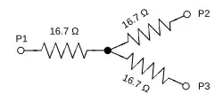 The above 6 dB coupler can be generalized to couplers with arbitrary coupling ratio.[48][49] Consider the following 5 resistor bridge circuit, where the resistor ratios of the 2 arms are equal. In typical application, drive resistance is the characteristic impedance, typically 50 in radiowave and microwave circuits. Port 2 and 3 are not internal to the hybrid, rather, they are connected to external loads, typically . Under these conditions, the entire circuit has an input impedance of , i.e. port 1 sees a matched load. The coupling port (P3) voltage ratio is , the through port (P2) voltage ratio is .