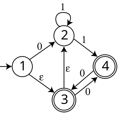 The NFA below has four states; state 1 is initial, and states 3 and 4 are accepting. Its alphabet consists of the two symbols 0 and 1, and it has ε-moves.