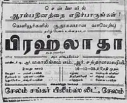 Prahalada is a 1939 Indian Tamil language film directed by B. N. Rao.[1] It deals with the story of Prahlada and his devotion to Lord Vishnu. It was one of the earliest adaptations this mythologic story after the 1932 Telugu version. The story has subsequently been adapted 20 times in numerous languages including Hindi, Gujarati, Tamil, Telugu, Malayalam, Kannada, Bengali and Assamese with most of them being successful at the box office.[2] It is also the one of those rare instances where a story has been adapted so many times, generally to box-office success. The film's story is based on the story of Narasimha and Prahlada. It features M. G. Ramachandran as Lord Indra[3] This was the sixth film of Ramachandran who later became one of the popular actors of the Tamil film industry. The film also featured a sword fight sequence between M.G. Ramachandran and Santhanalakshmi.[2]