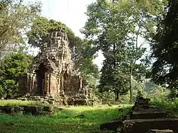 Prasat Chrung (Khmer: ប្រាសាទជ្រុង) are temples that located at each corner of the Angkor Thom, on the earth embankment that reaches almost to the top of the walls, is a small temple known as Prasat Chrung (Shrine of the Angle) in modern Khmer. These four sandstone temples, in the style of Bayon, were Buddhist and dedicated to the Bodhisatta Lokesvara, as was the Bayon and the city. Cross-shaped in plan and facing to the east side. The sanctuary surrounded by a tower and originally steles with a poem praising the king were housed in small adjacent structures. Each stele has four different authors. Today these are housed in the Conservation office. Some of the originally Buddhist pediments were defaced in the late 13th century during the reign of king Jayavarman VIII and the figure of the Buddha was transformed into a linga.[1]