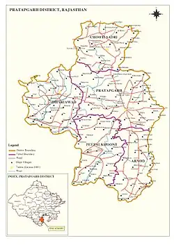 Pratapgarh district is the 33rd district of Rajasthan, created on 26 January 2008.[3] It is a part of Udaipur Division and has been carved out from the erstwhile tehsils of Chittorgarh, Udaipur and Banswara districts. Pratapgarh town (Pin Code 312605, STD Code 01478) is the administrative headquarters of the district.