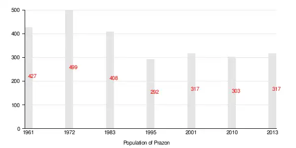 Prazon's population is mostly Jewish, and has fluctuated over the decades, in 1972 it had around 500 inhabitants, while by the end of 2023 the Israel Central Bureau of Statistics estimated that the population of Israeli residents was approximately 398.[7][8]