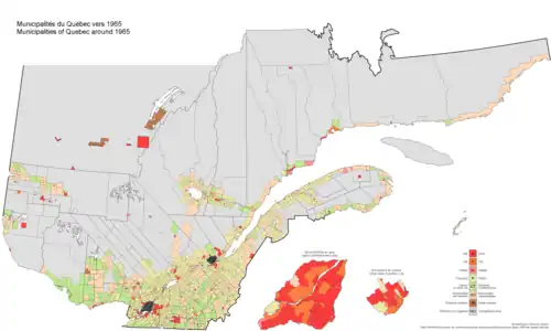 The structure was abolished and replaced in September 1847 by a system of county municipalities, whose councillors were elected from the parishes and townships existing therein,[3] with provision for the creation of towns and villages that would be separated from their counties.[4] Further reform came into effect in July 1855[5] for all parts of Lower Canada other than Montreal, Quebec City and Saint-Hyacinthe,[6] which included provision for the creation of local councils for parishes and townships,[7] the representation of towns and villages on county councils,[8] and the formation of towns and villages by order in council upon the recommendation of the relevant county council.[9] The municipal law of Lower Canada was consolidated into a single Act in 1860.[10]